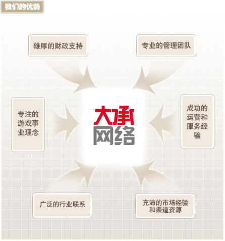大承心无旁骛地专注于发展依托于互联网的中国数字互动娱乐事业,致力于为中国的广大玩家量身定做丰富而优质的电脑娱乐体验,并为成为该行业领先者的目标而全力以赴。